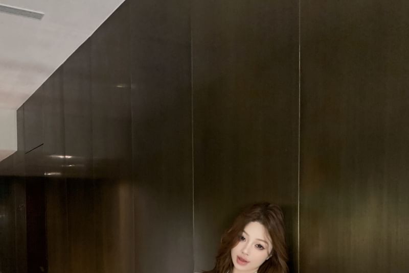 Embroidered High Bow Long-Sleeve Skirt Mini Pencil Flower Ruched / Shirt Rise