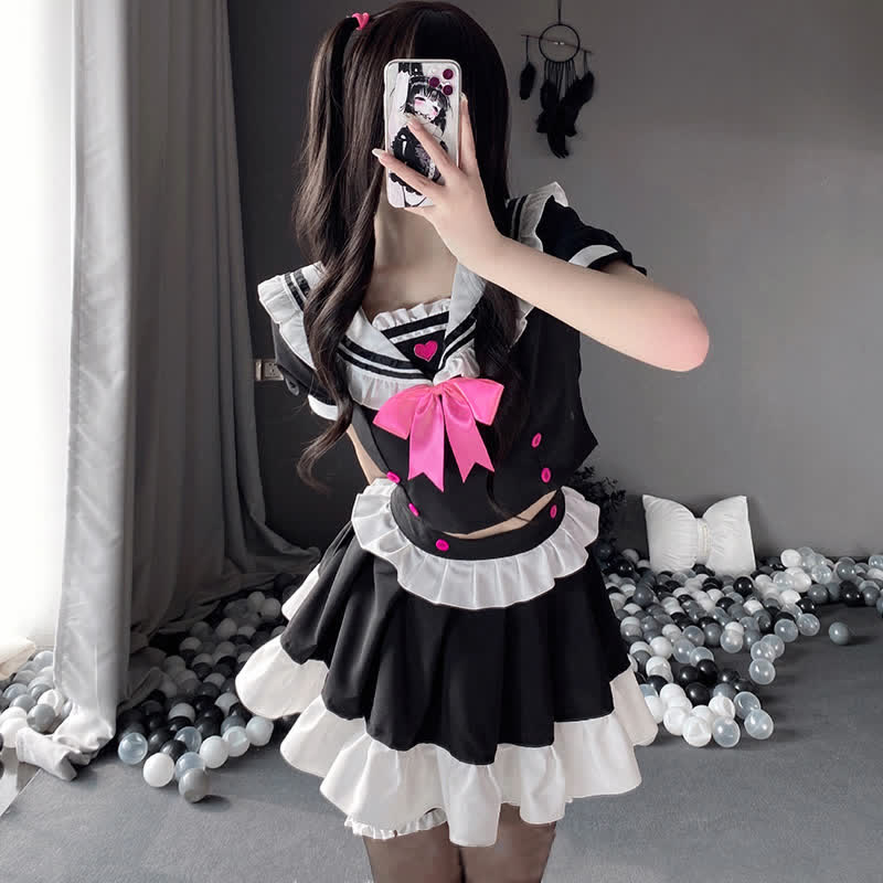 Enchanting Maid Bowknot Love Heart Lingerie Stockings Set