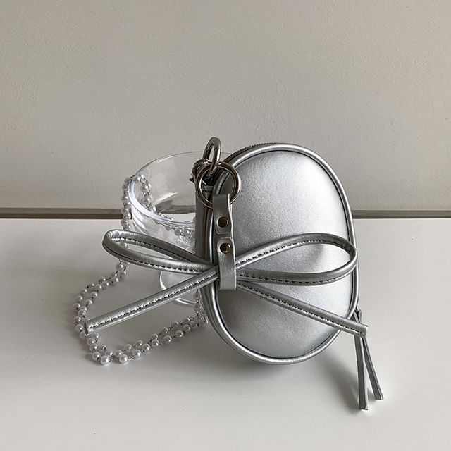 Set: Faux Pearl Strap Plain Faux Leather Crossbody Bag + Bag Charm