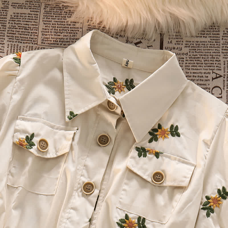 Floral Embroidery Lapel Pocket T-Shirt Long Skirt
