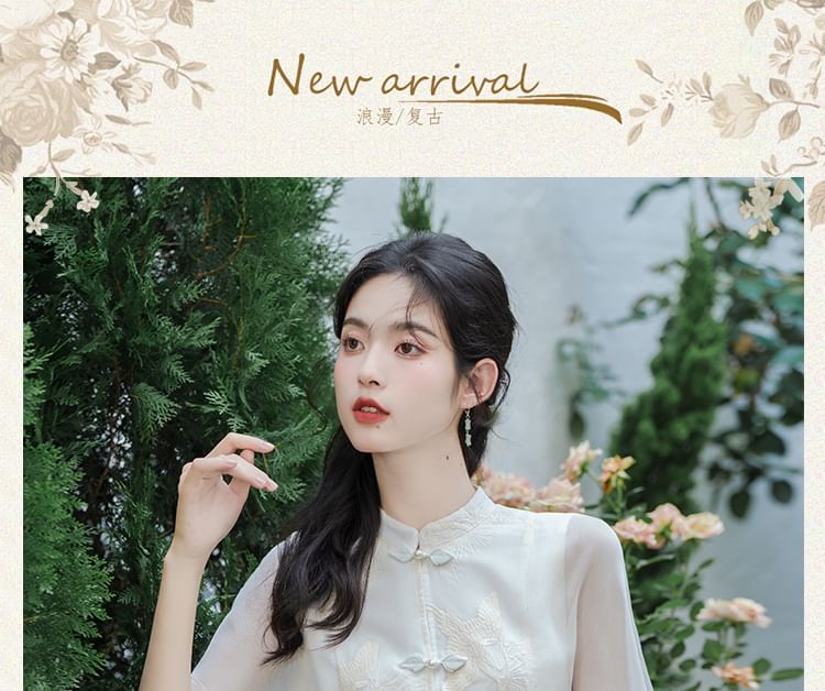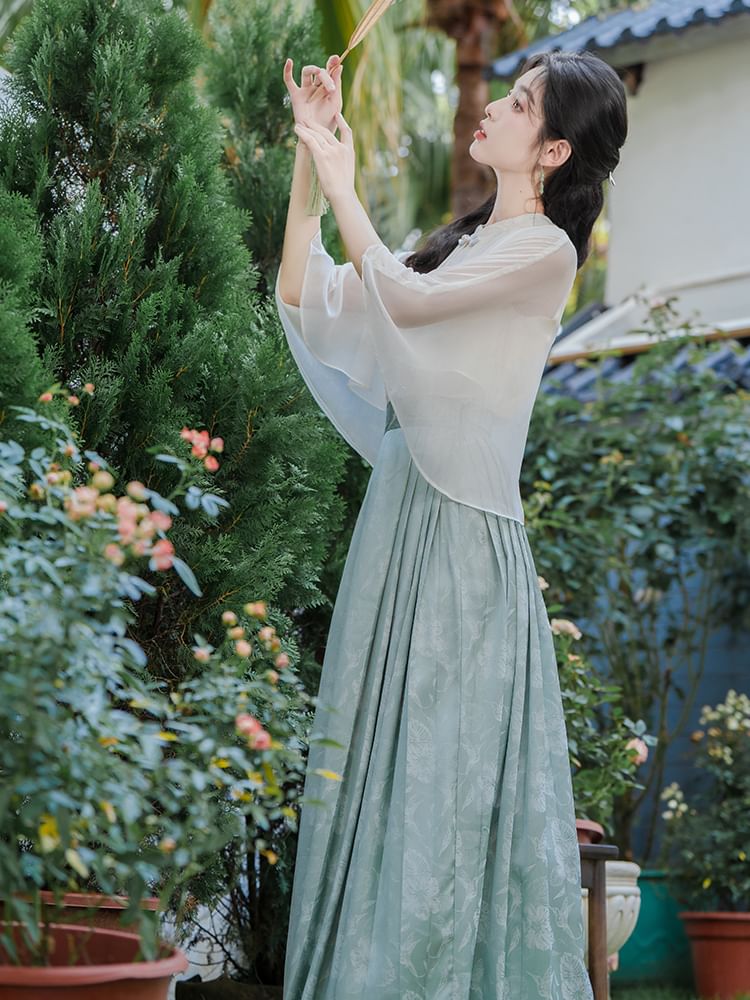 Flutter Sleeve Mandarin Collar Plain Blouse / High Rise Patterned Print Pleated Maxi A