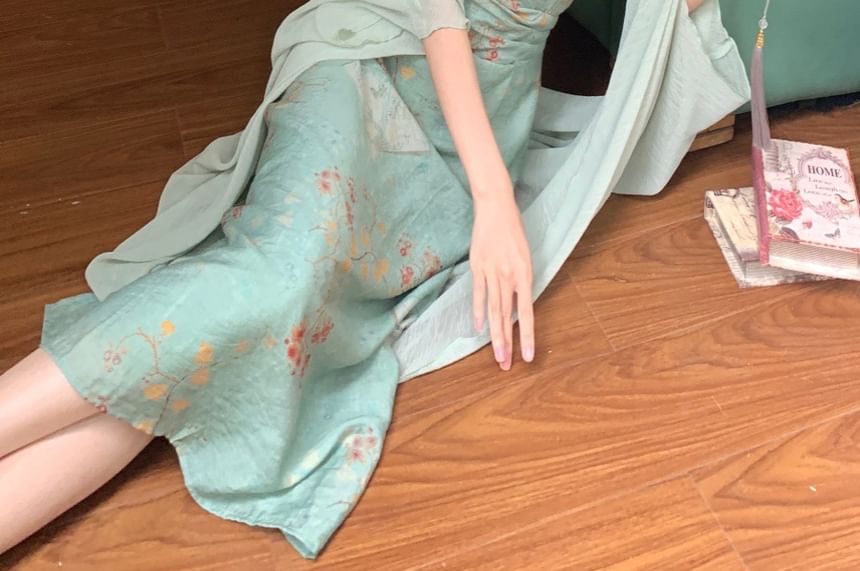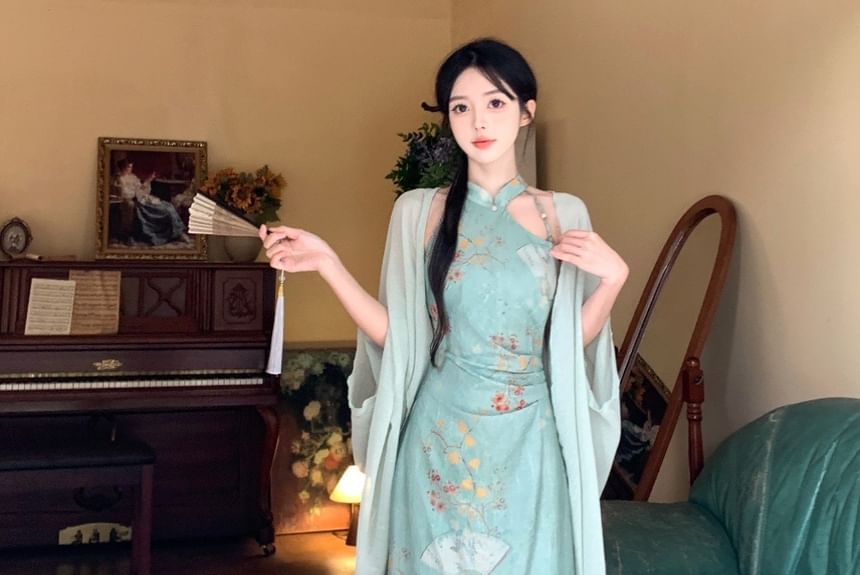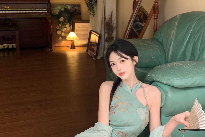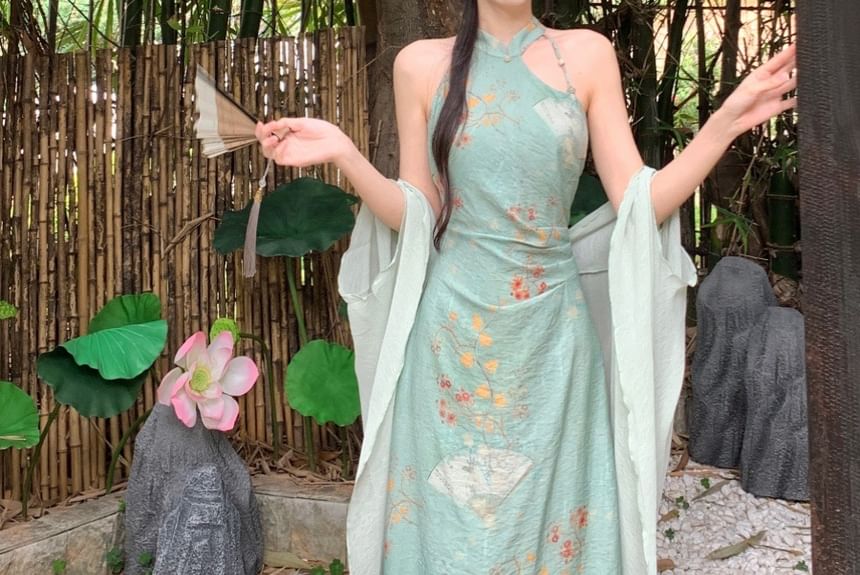 Halter Floral Ruched Midi Sheath Dress / Elbow-Sleeve Plain Long Light Jacket / Set