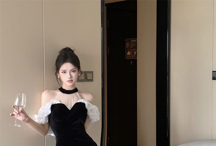 Halter Neck Cold Shoulder Mesh Panel Frill Trim Velvet Mermaid Evening Gown