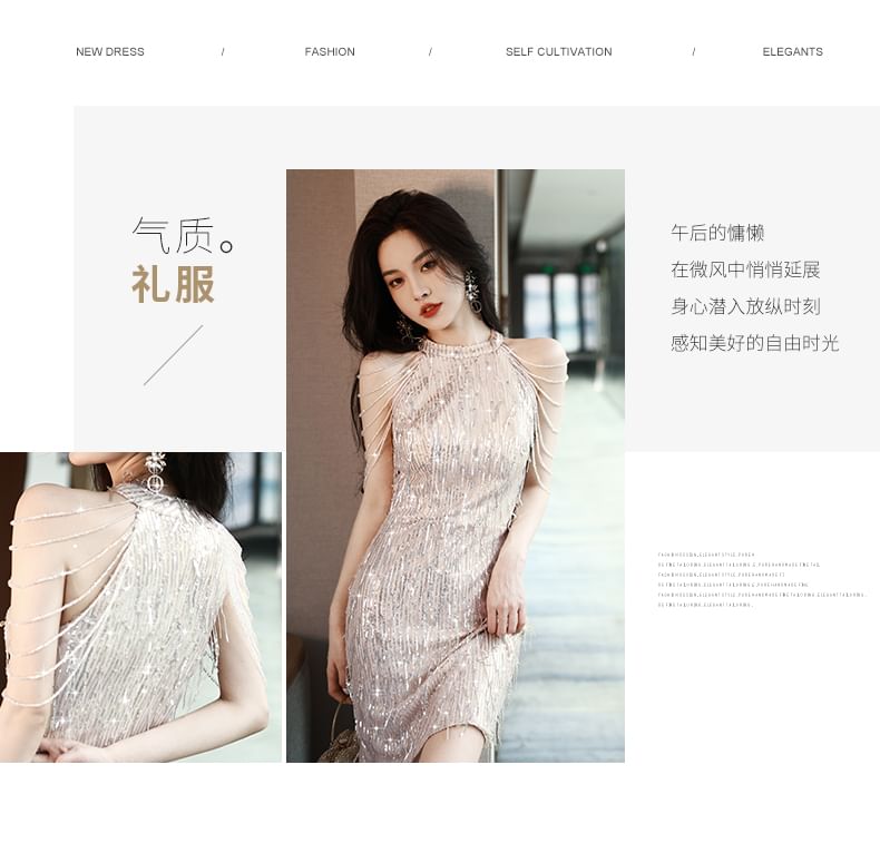 Halter Neck Cold Shoulder Plain Sequin Fringed Mini Bodycon Dress