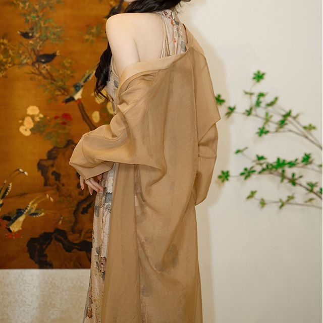 Halter-Neck Floral Print Midi Mermaid Dress / Puff-Sleeve Open Front Cardigan / Set