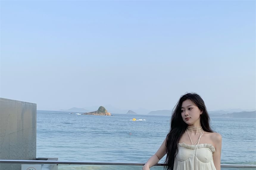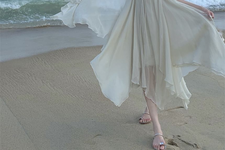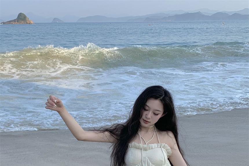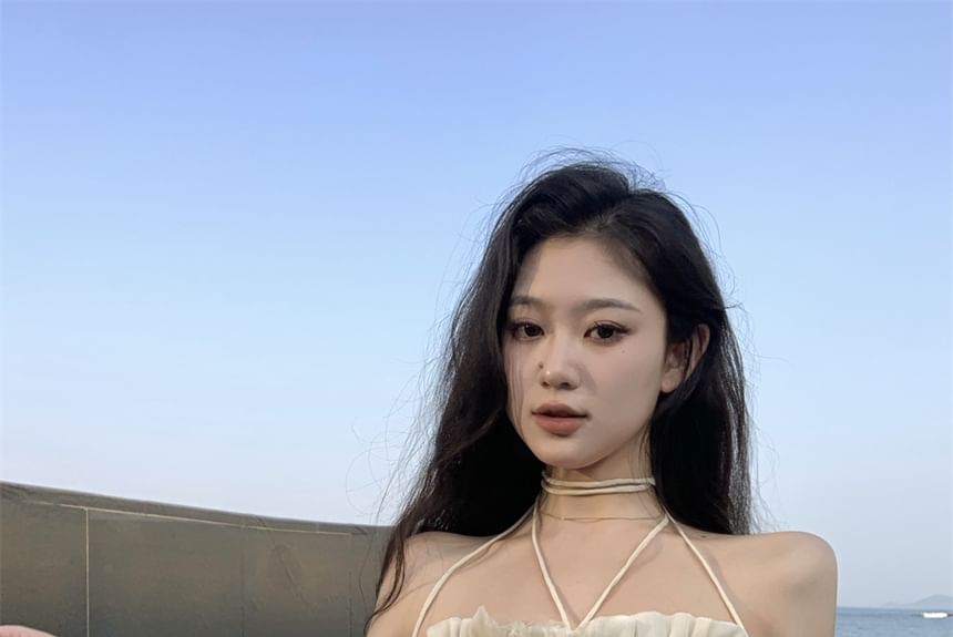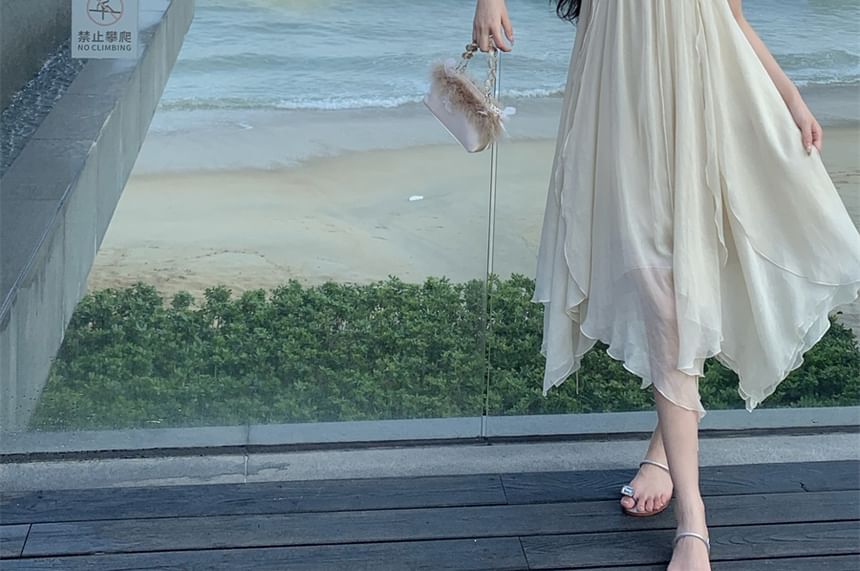 Halter Neck Plain Asymmetrical Frill Trim Open Back Midi A