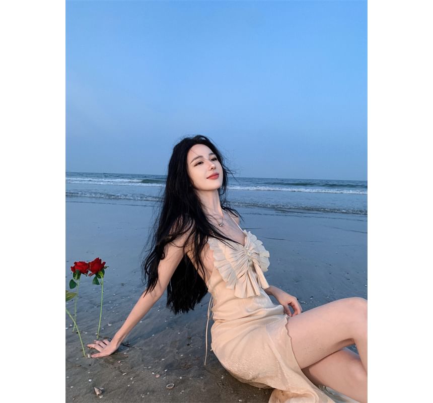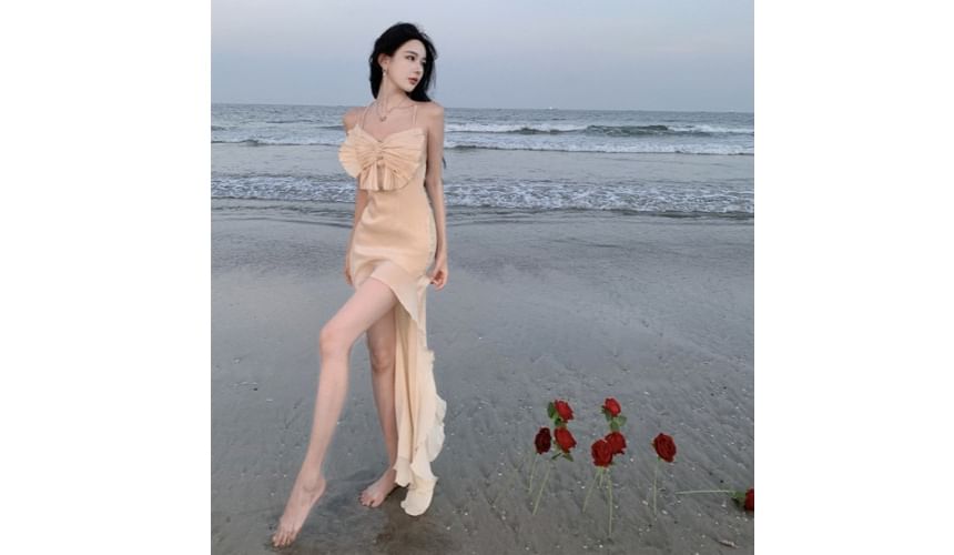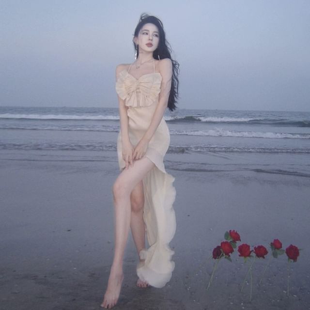 Halter-Neck Plain Bow High Low Mermaid Dress