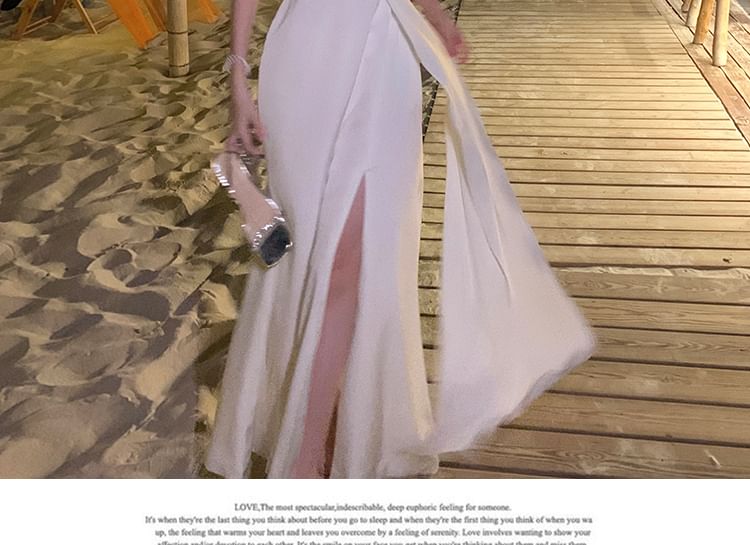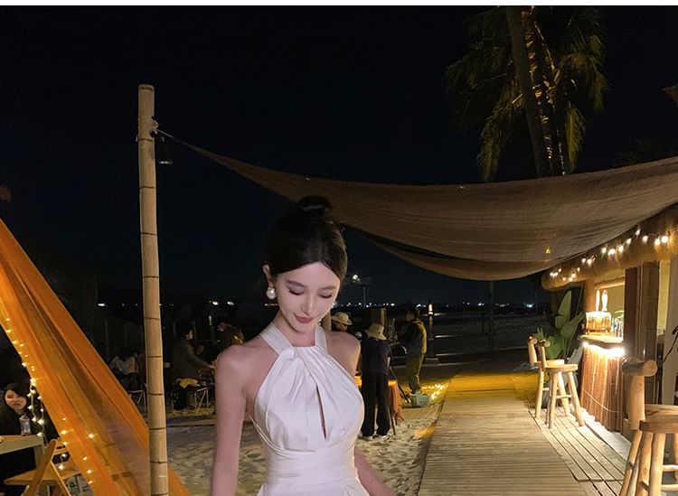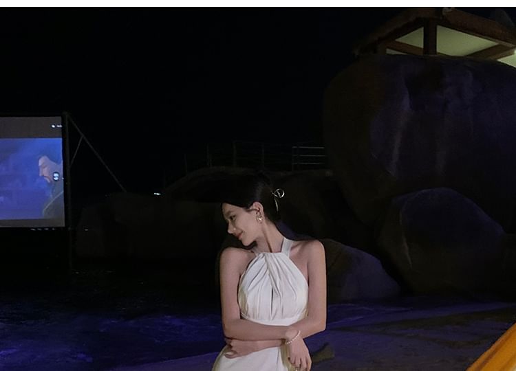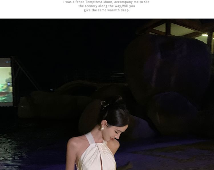 Halter Neck Plain Cutout Open Back Slit Satin Maxi A
