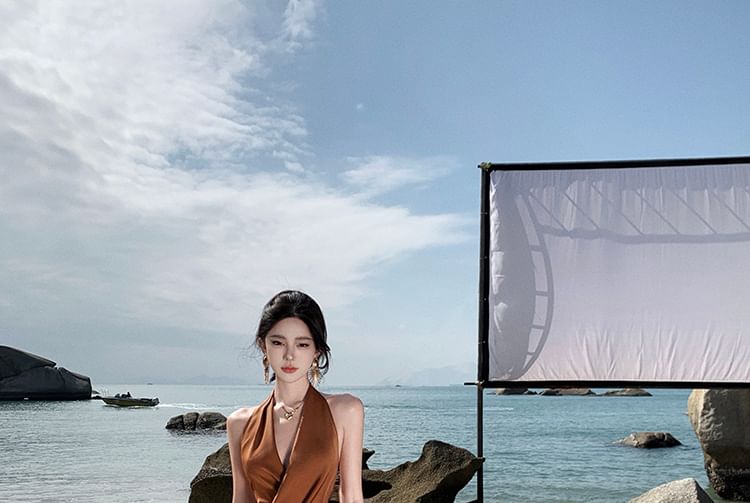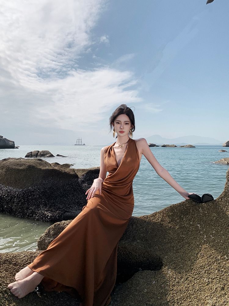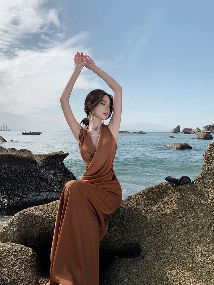 Halter-Neck Plain Shirred Midi Bodycon Dress