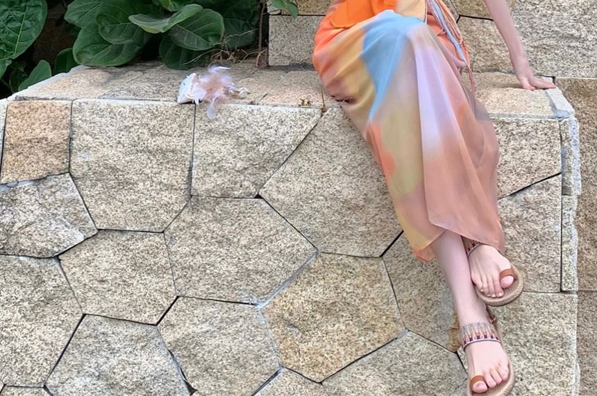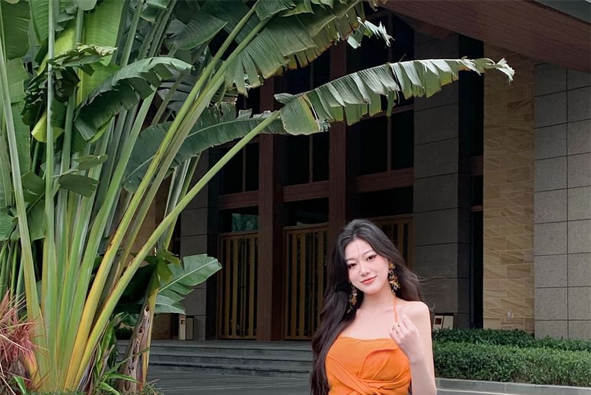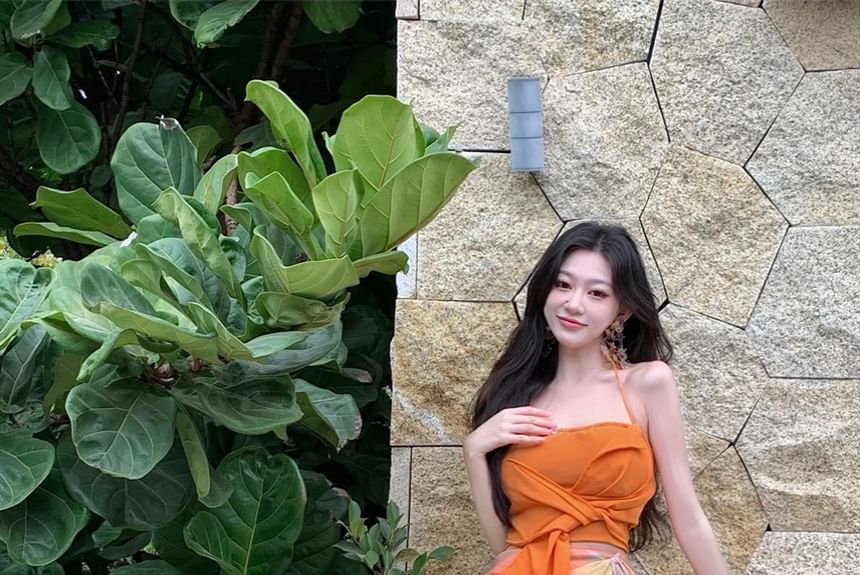 Halter Neck Plain Tie Waist Open Back Crop Top / High Waist Tie Dye Tie Side Maxi Straight Skirt / Set