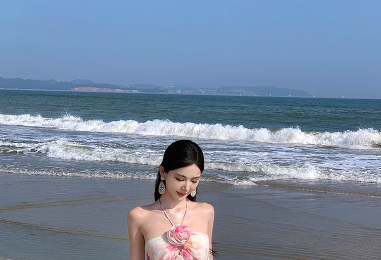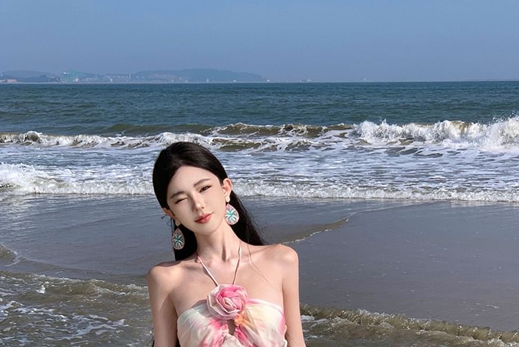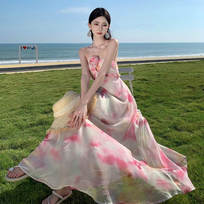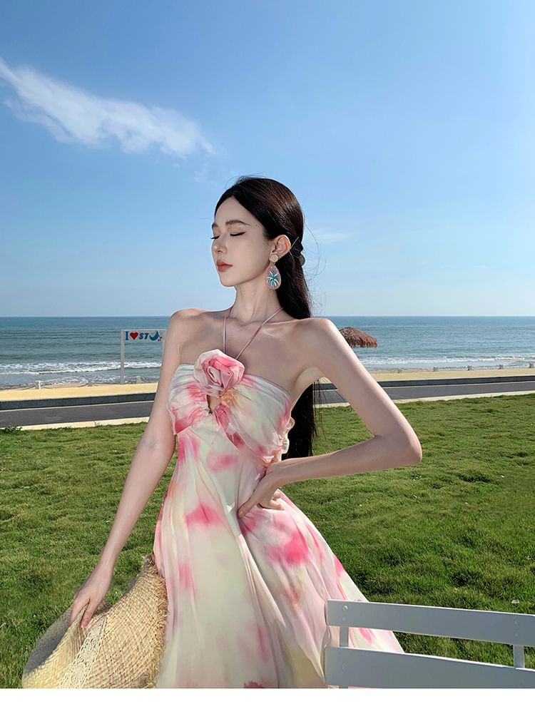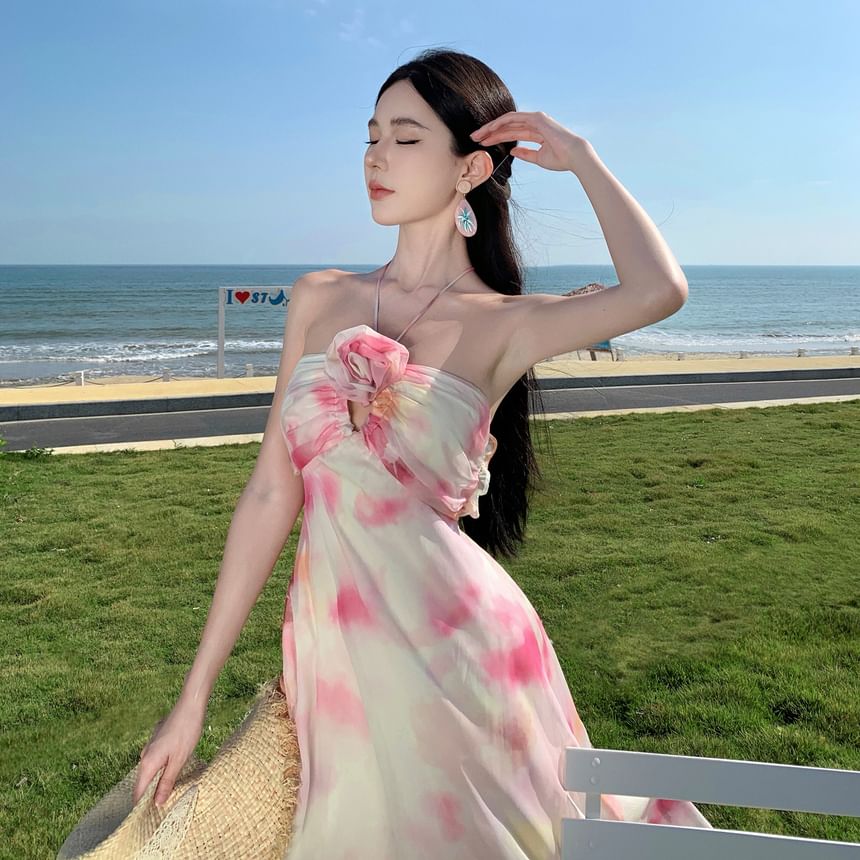 Halter Neck Tie Dye Floral Accent Cutout Open Back Maxi A