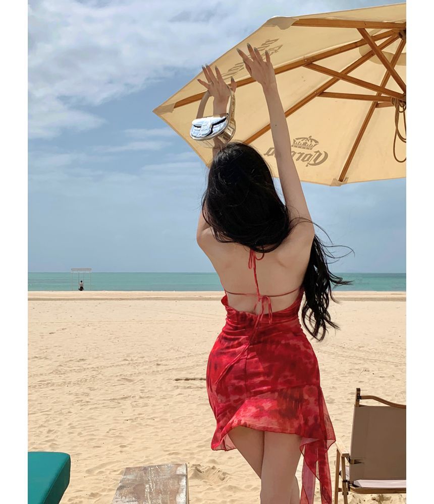 Halter Tie Dye Ruffle Asymmetrical Mini Sheath Dress