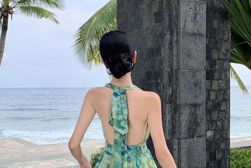 Halter V-Neck Patterned Print Tiered Maxi A-Line Dress