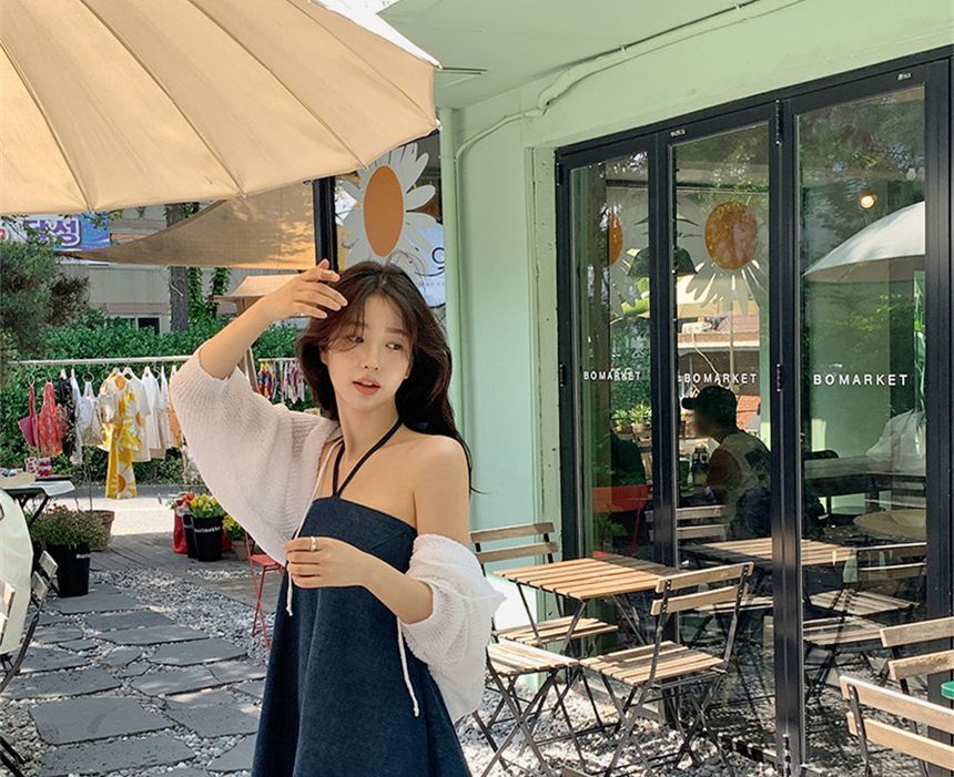 Halter Washed Mini A-Line Denim Dress