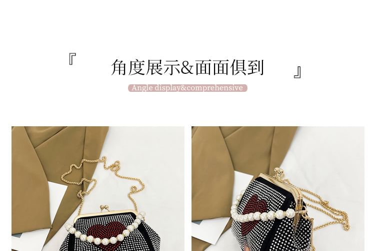 Heart Patterned Rhinestone Kiss Lock Faux Pearl Handle Evening Bag