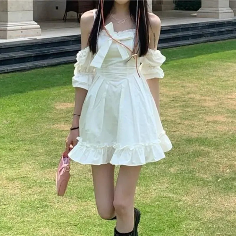 Iris Angelcore Kawaii Princess Mini-robe à épaules dénudées avec décoration en nœud et accents de volants