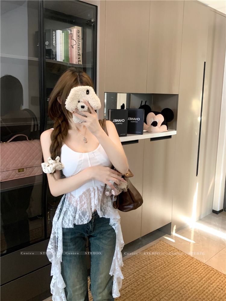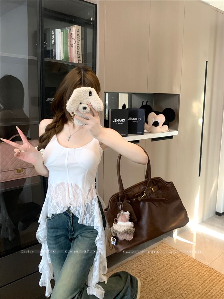 Scoop Neck Plain Lace Trim Asymmetrical Camisole Top