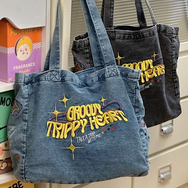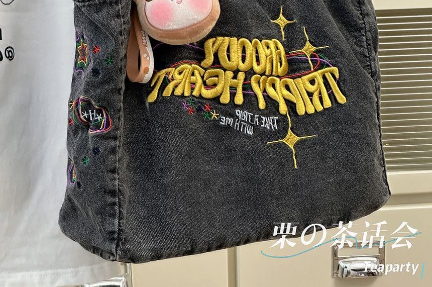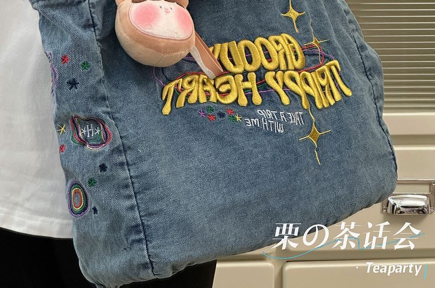 Letter Embroidered Denim Tote Bag / Bag Charm / Set
