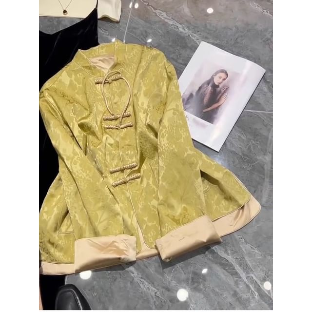 Long-Sleeve Band Collar Floral Hanfu Blouse / Spaghetti Strap V-Neck Plain Midi A-Line Dress / Set