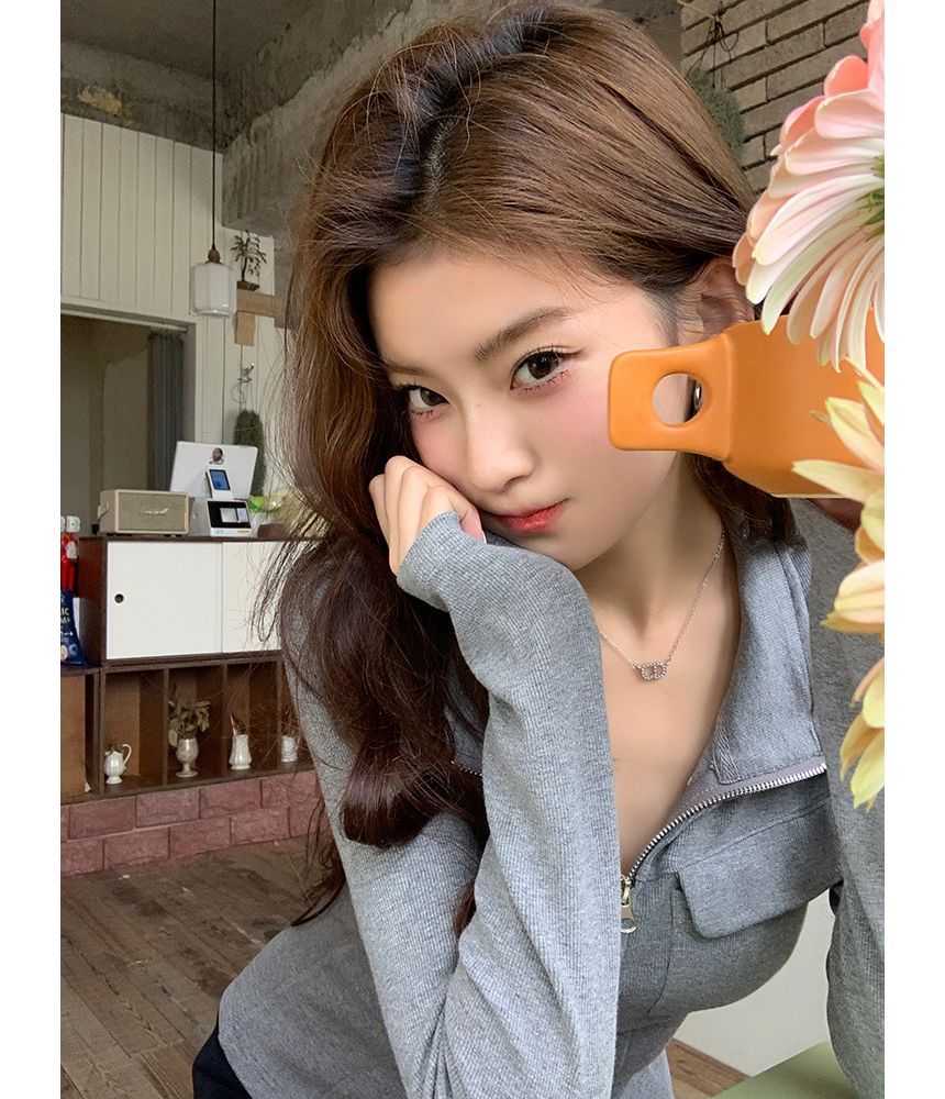 Long-Sleeve Collar Plain Zip Slim Fit Top