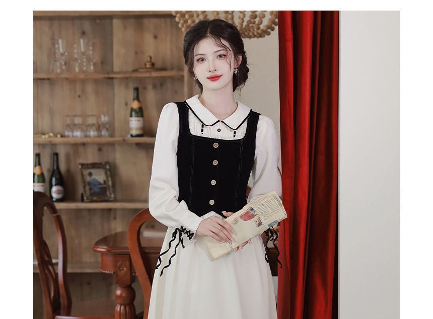 Long-Sleeve Collared Contrast Trim Midi A-Line Dress / Square Neck Plain Lace Trim Button-Up Crop Vest / Set