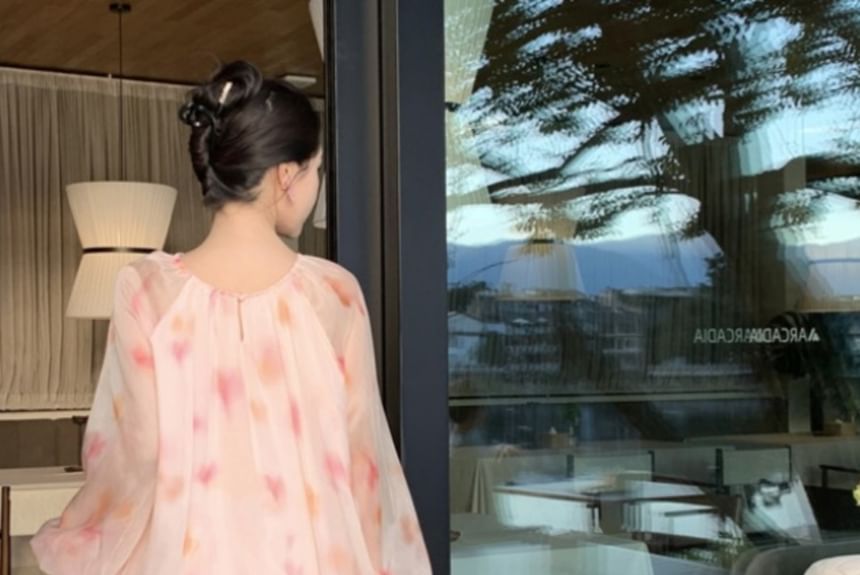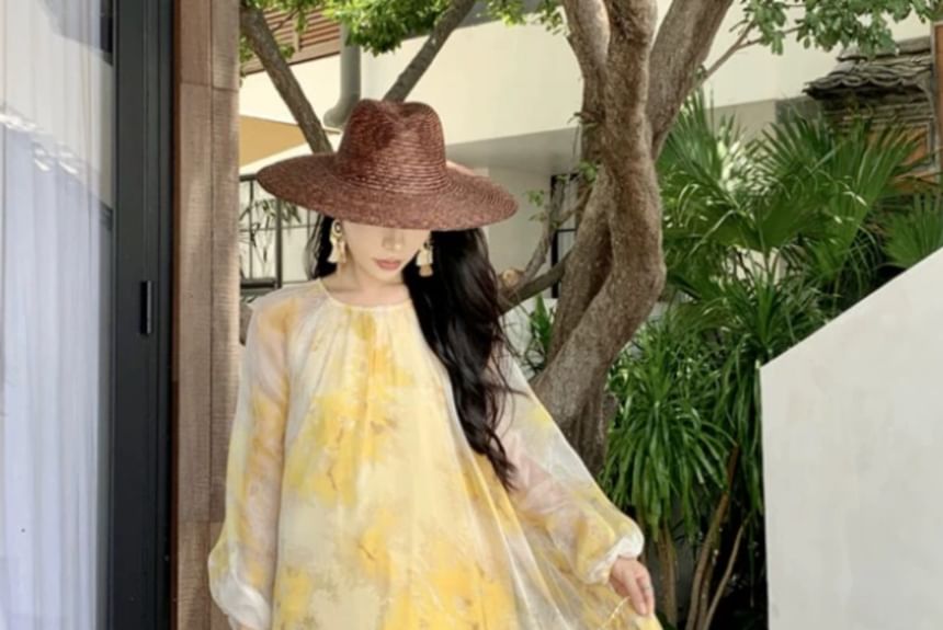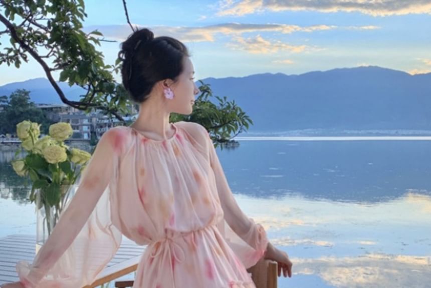 Long-Sleeve Crew Neck Tie Dye Ruffle Midi A-Line Dress
