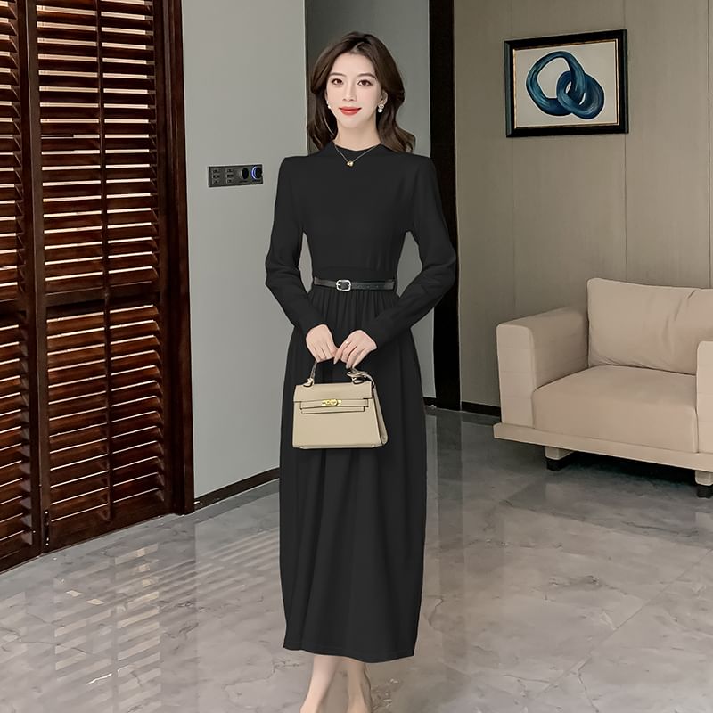 Long-Sleeve Mock Neck Plain Cutout Back Midi A-Line Knit Dress
