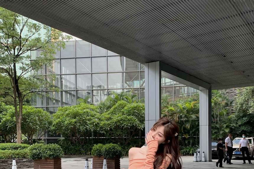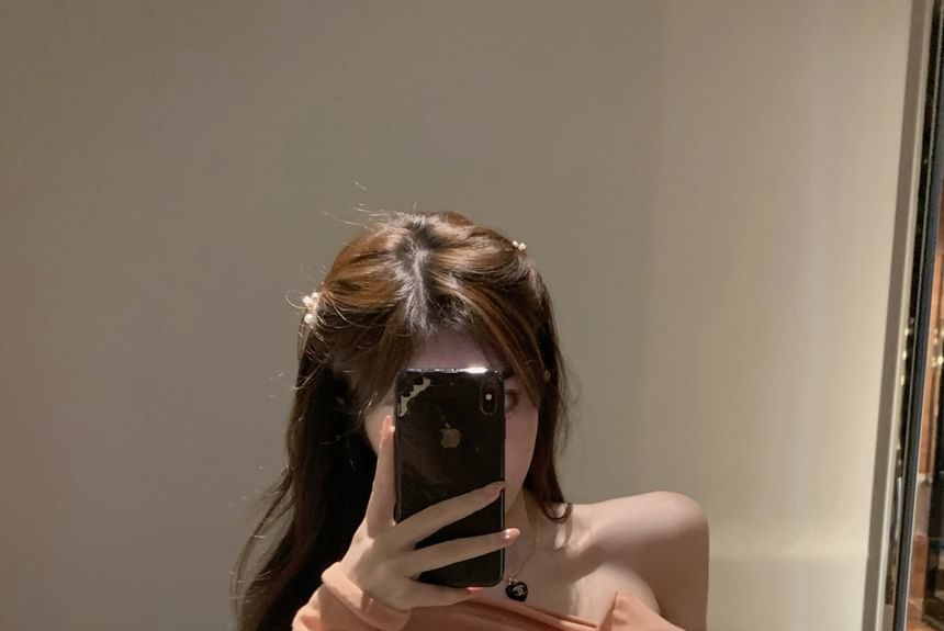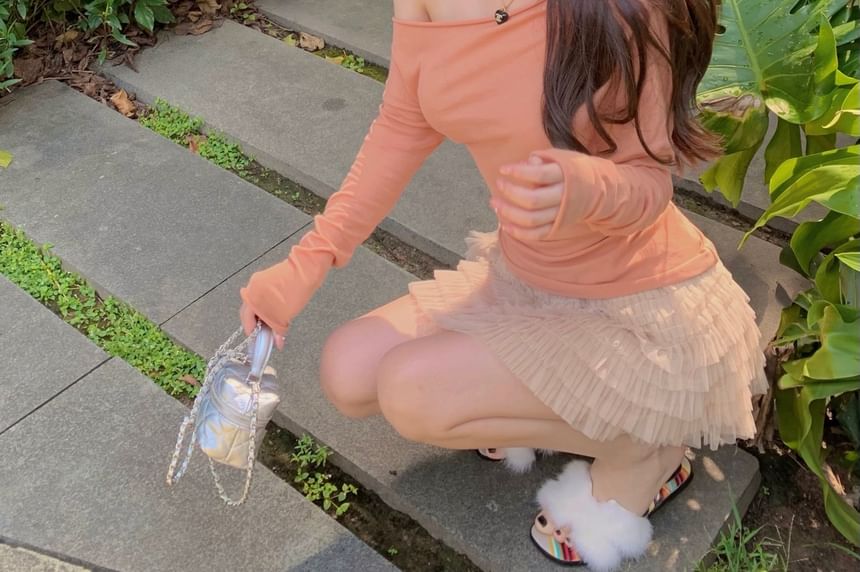 Long-Sleeve Off-Shoulder Plain Slim Fit T-Shirt / High Waist Tiered Mini A-Line Tulle Skirt