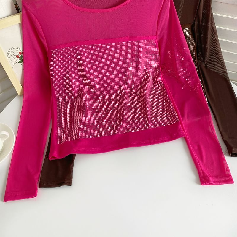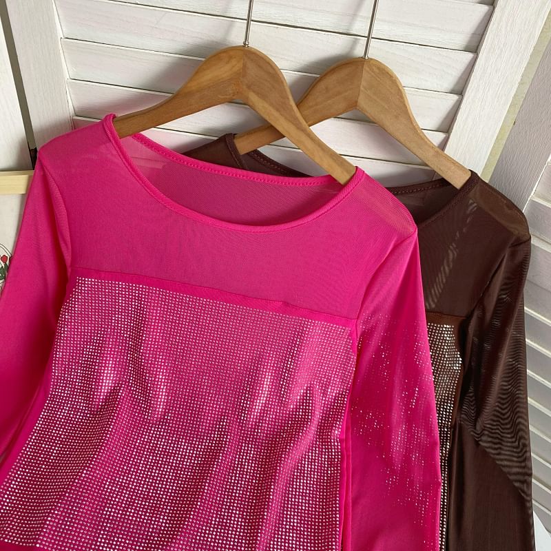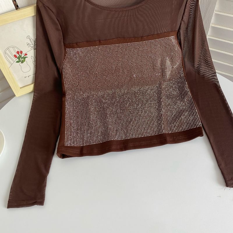 Long-Sleeve Scoop Neck Rhinestone Mesh Top