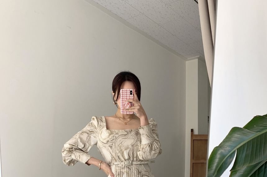 Long-Sleeve Square Neck Floral Midi A-Line Dress