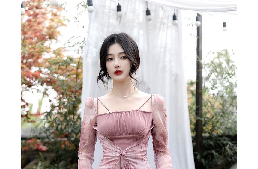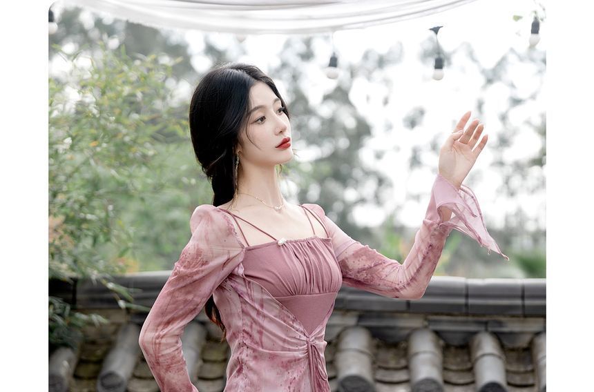 Long Sleeve Square Neck Tie Dye Layered Midi Dress