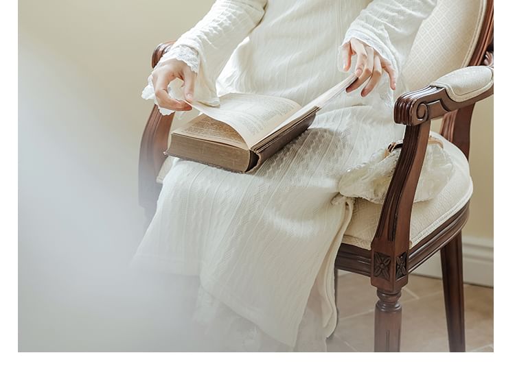 Long Sleeve Stand Collar Plain Lace Trim Ribbed Knitted Midi A-Line Dress