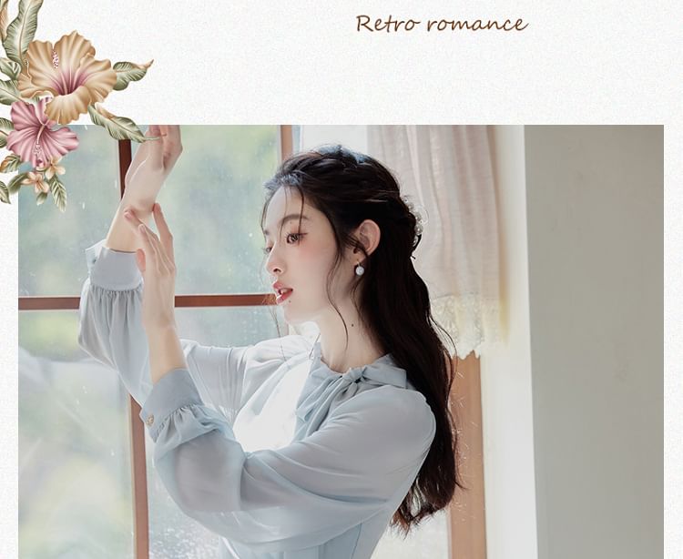 Long-Sleeve Tie Neck Plain Maxi A-Line Dress