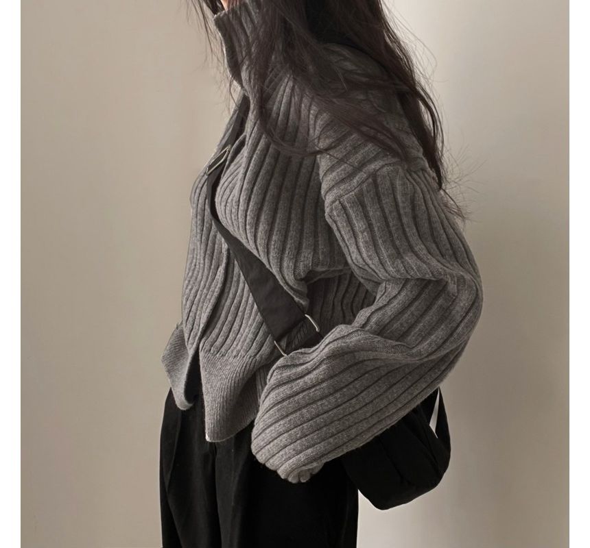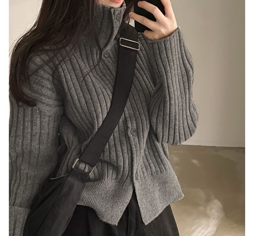 Long-Sleeve Turtleneck Buttoned Rib-Knit Cardigan