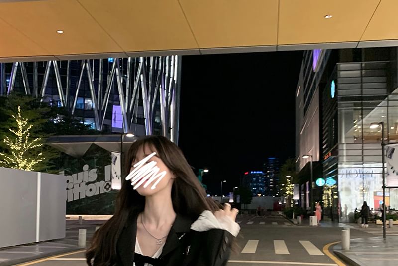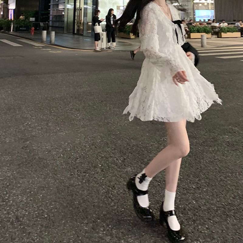 Long-Sleeve V-Neck Bow Lace Mini A-Line Dress / Plain Crop Blazer