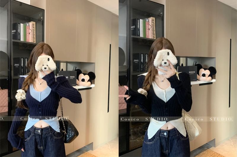Long Sleeve V-Neck Collared Mock Two Piece Button Knit Top