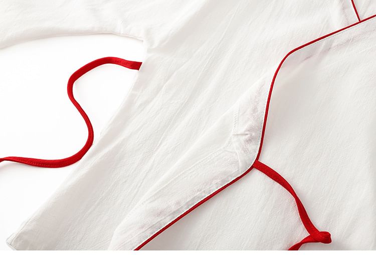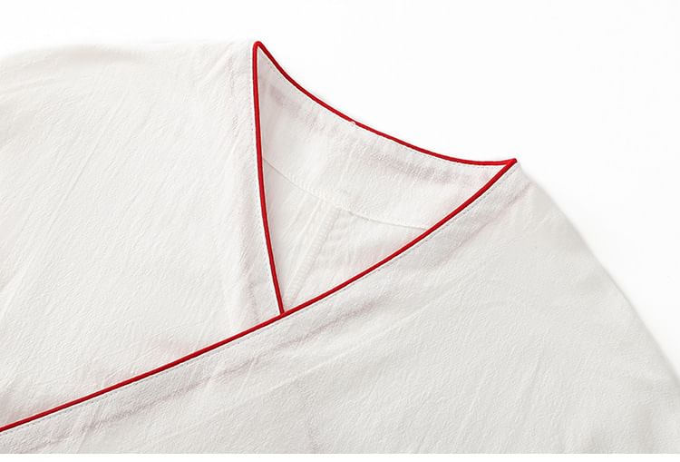 Long-Sleeve V-Neck Contrast Trim Hanfu Top / Mid Rise Plain Wide Leg Pants