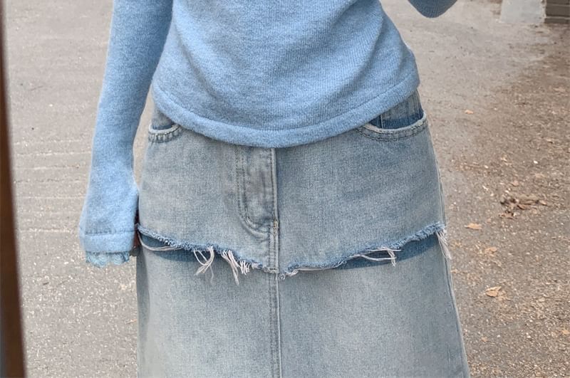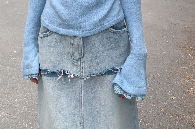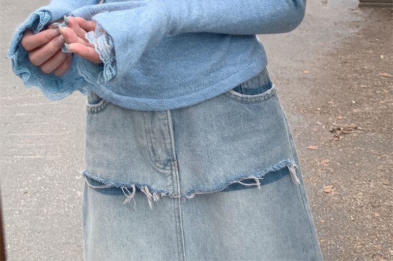 Long-Sleeve V-Neck Plain Bow Accent Lace Trim Slim Fit Knit Top