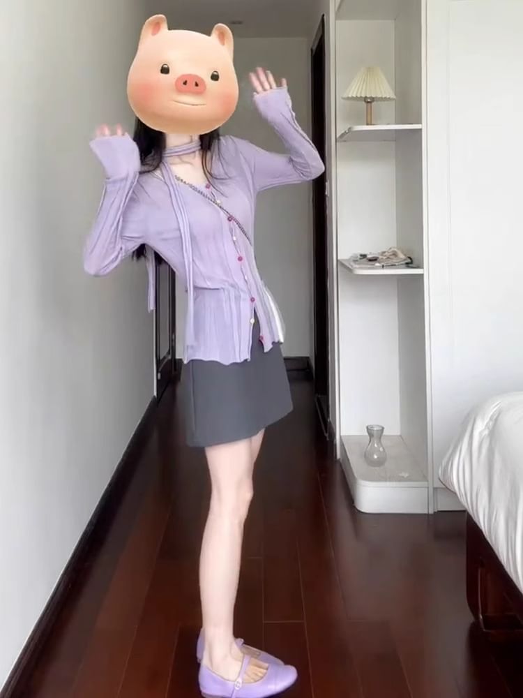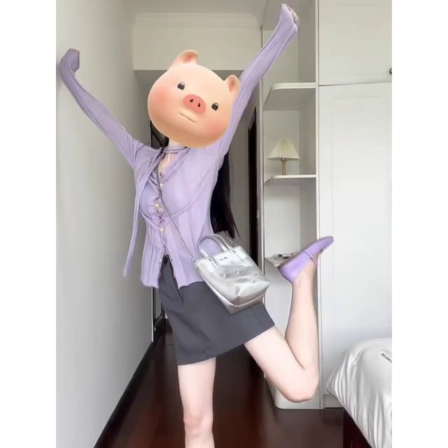 Long-Sleeve V-Neck Plain Button Knit Top / Mid Waist Plain Mini A-Line Skirt / Set
