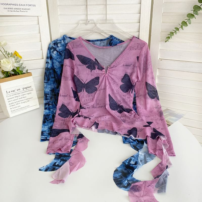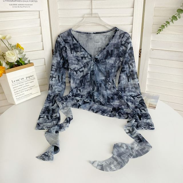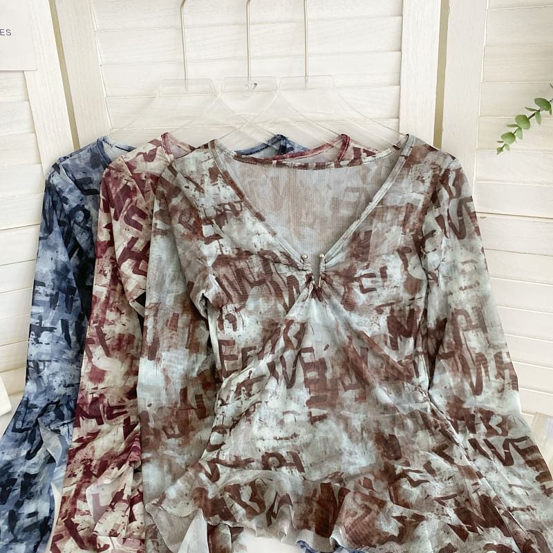 Long-Sleeve V-Neck Print Asymmetrical Mesh Top