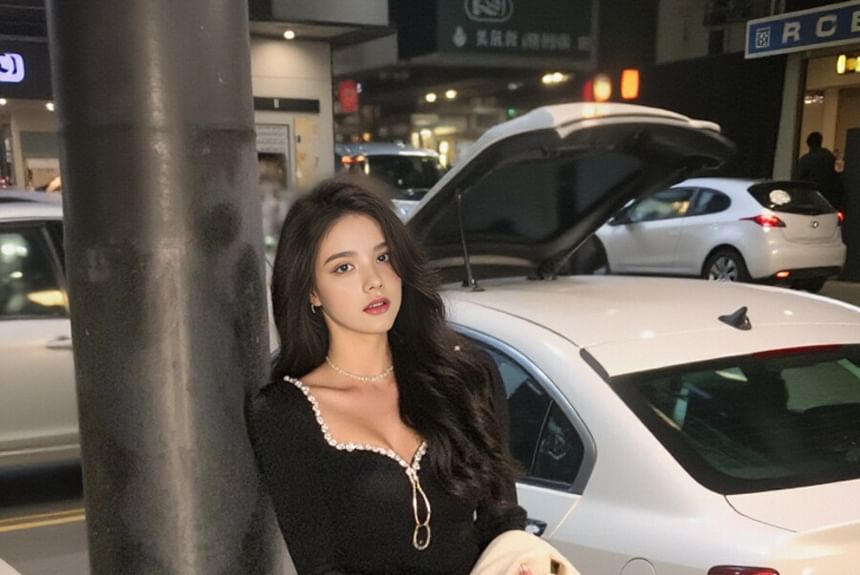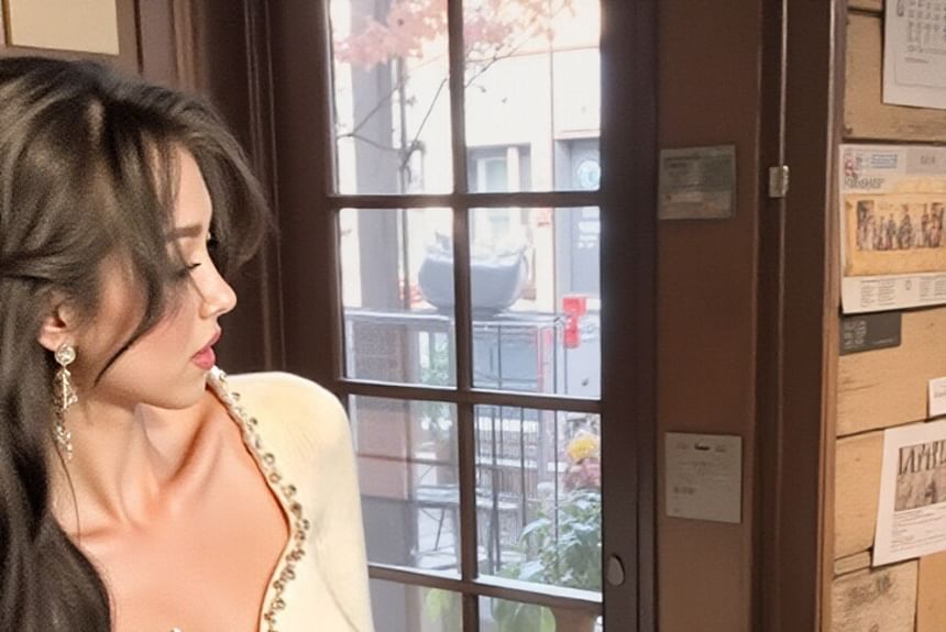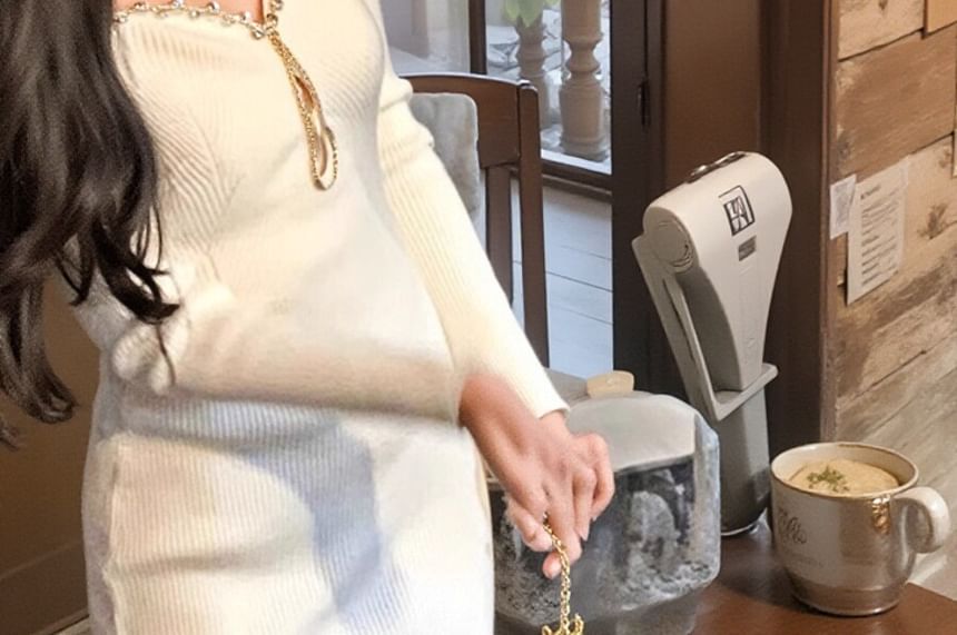 Long Sleeve V-Neck Rhinestone Plain Ribbed Knitted Midi Bodycon Dress
