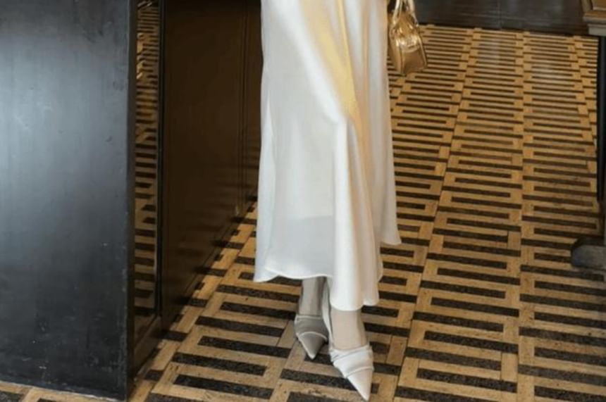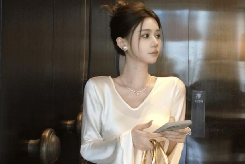 Long-Sleeve V-Neck Satin Plain Maxi Sheath Dress