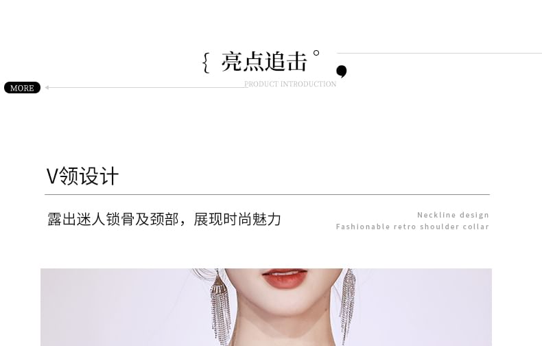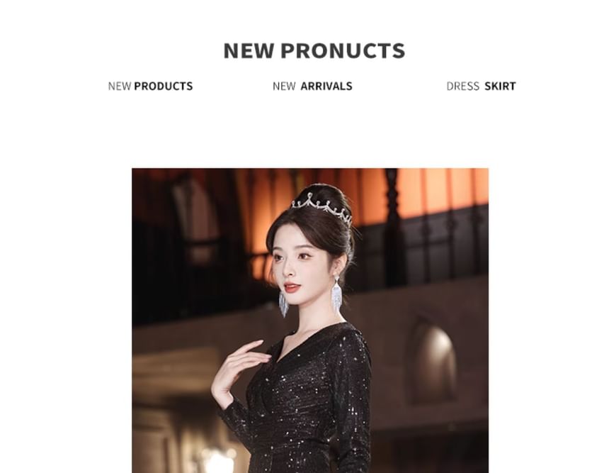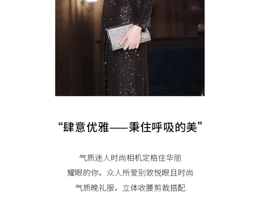 Long-Sleeve V-Neck Sequined Slit Mermaid Evening Gown