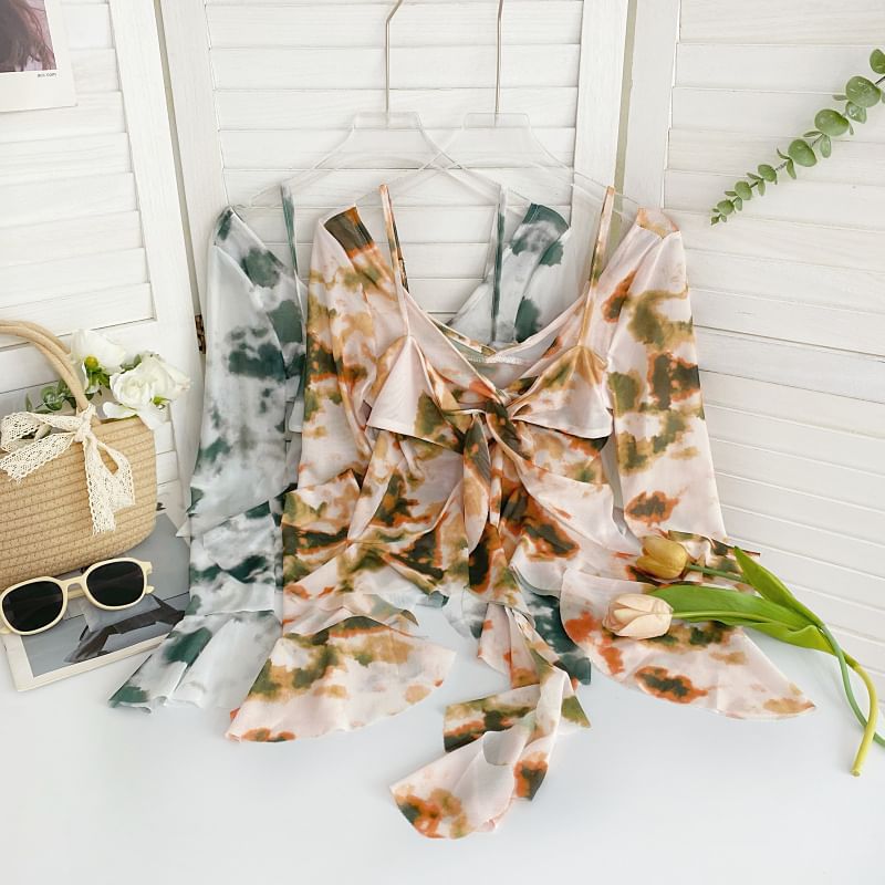Long-Sleeve V-Neck Tie Dye Mock Two Piece Mesh Top