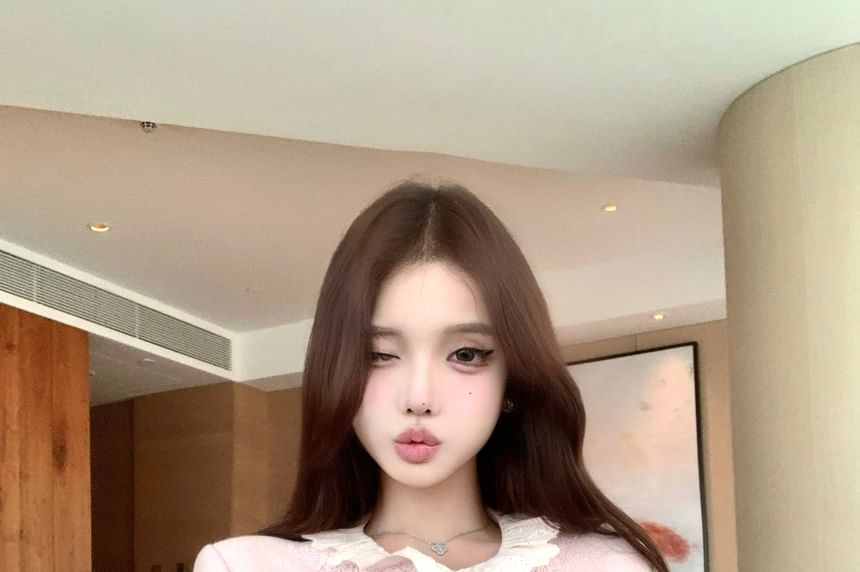 Long-Sleeve Ruffle Collar Button-Up Blouse / High Waist Tweed Shorts / Lace-Trim Jacket / Floral Brooch / Set