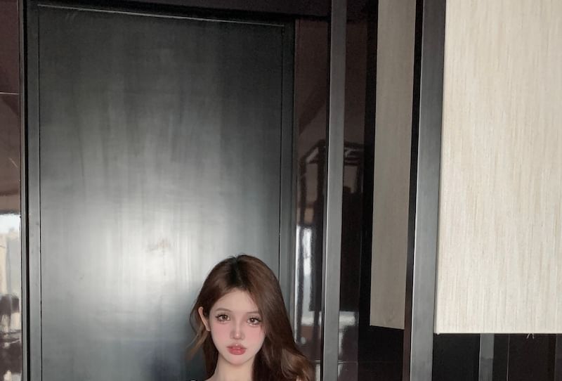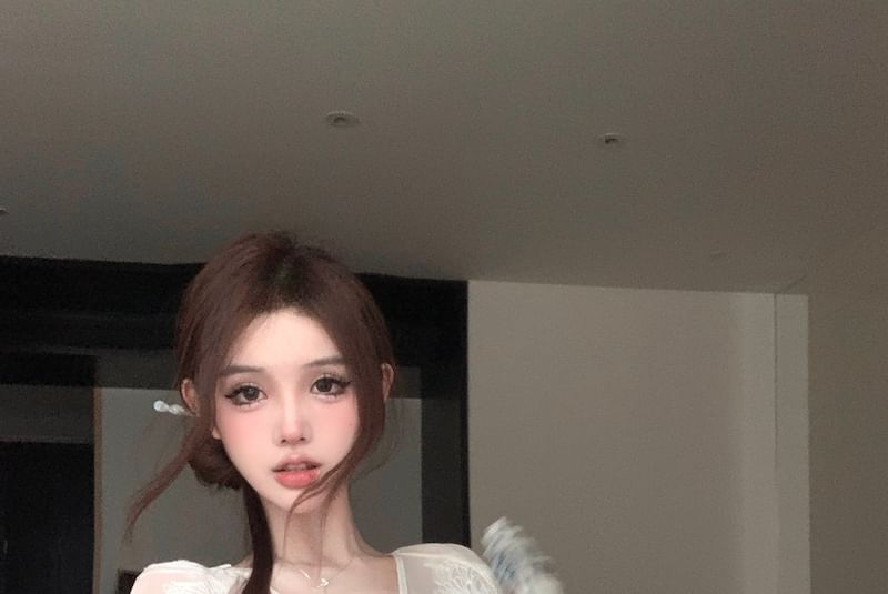 Maxi Top Blouse Set Plain Puff-Sleeve Embroidered Flower Rise Shorts / V-Neck A-Line Skirt Camisole High