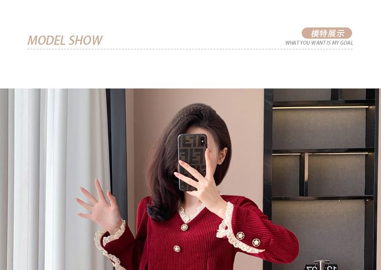 Mock Two-Piece Long-Sleeve V-Neck Lace Trim Corduroy Mini A-Line Dress