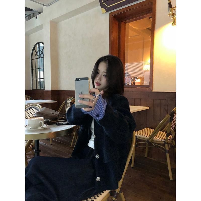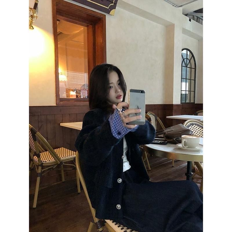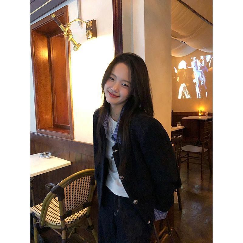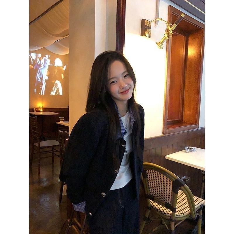 Mock Two-Piece Collared Plaid Panel Button-Up Tweed Crop Jacket
