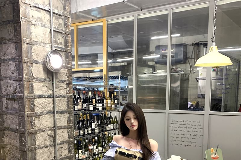 Mock Two-Piece Long-Sleeve Off-Shoulder Striped Panel Smocked Crop Blouse / High Waist Mini A-Line Skirt / Belt / Set