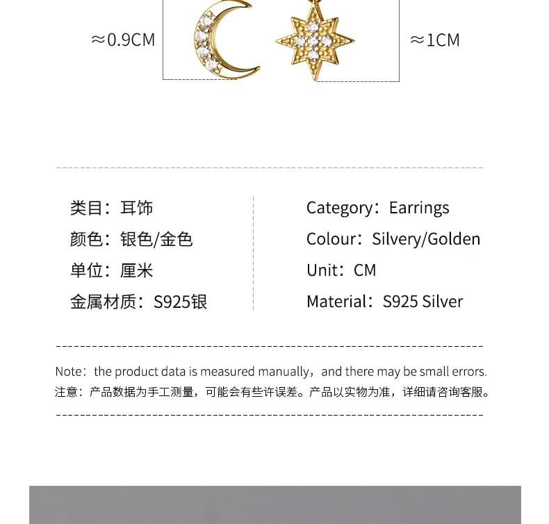 Moon & Star Rhinestone Asymmetrical Sterling Silver Drop Earring